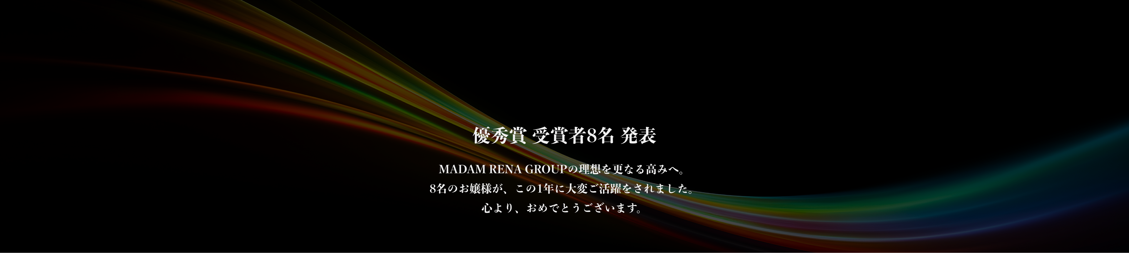 長きに渡り数多くの芳しき女性が在籍。そのお一人お一人の美しさと気品が、MADAM RENA GROUPの誇り高き文化と美学を築きました。その系譜の中で、真の気品と品格を体現するレディたちを讃える「MRG AWARDS」。本アワードは、単なる表彰の場ではなく、時代を超えて磨かれてきた“麗しき女性たちの精神”を継承する、崇高なるセレモニー。選ばれし者のみが立つことを許されるこの舞台には、美しさへの敬意、努力への賛美が静かに息づいています。そして本年もまた、新たな栄光の章が刻まれます。その輝かしき功績を称え、感動と拍手に包まれるこの瞬間。私たちが築き上げてきた“優雅なる伝承”の象徴を、ここにご覧ください。